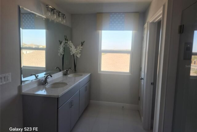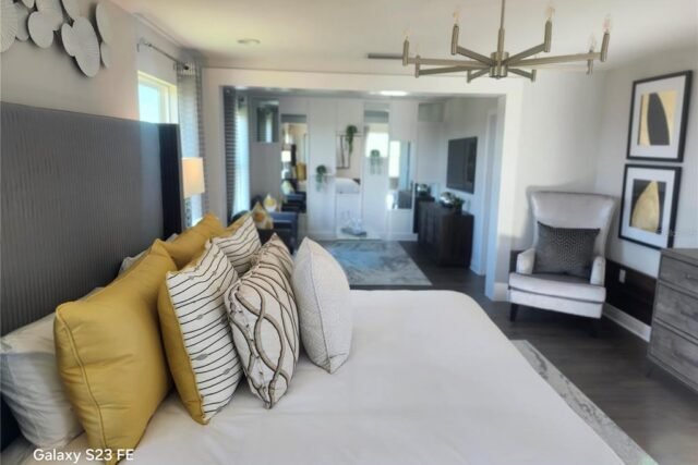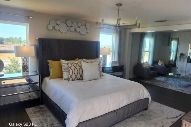 A suíte principal serve como um refúgio relaxante, com uma área de estar perfeita para relaxar. O banheiro da suíte inclui um grande closet, pia dupla e chuveiro.
